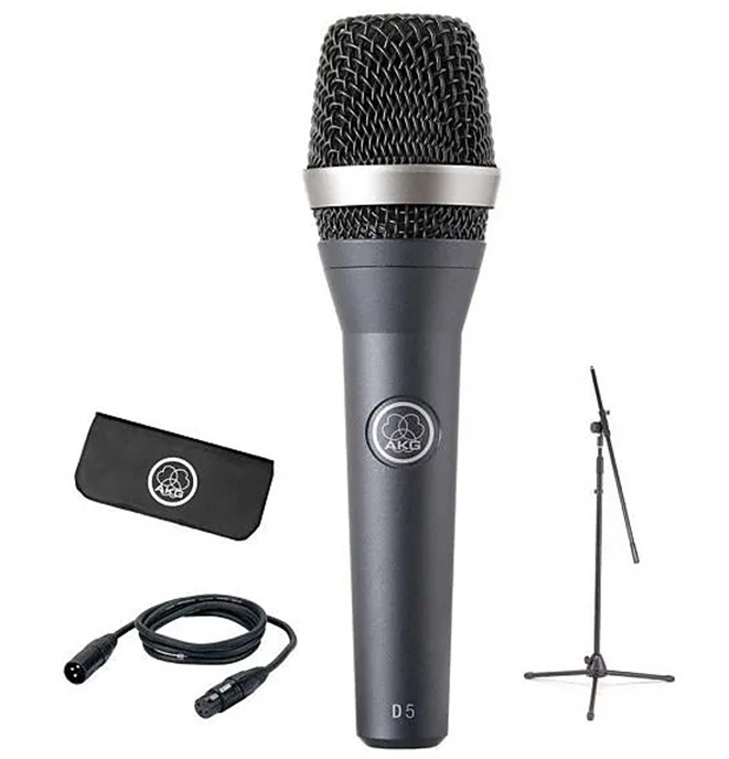 AKG D5 Stage Pack dynamisches Gesangsmikrofon  |  inkl. Kabel und Stativ Item no. 60303 Das dynamische Live-Mikrofon D5 sorgt für druckvollen Sound auch unter extrem lauten Bühnenbedingungen. Der breite Frequenzgang betont leicht die mittleren und hohen Frequenzen und liefert deshalb eine ausgezeichnete Sprachverständlichkeit. Die robuste Federstahl-Gitterkappe und das stabile Druckgussgehäuse aus Zink-Aluminium schützen Mikrofon und Kapsel vor Beschädigungen im rauhen Bühnen-Alltag Stage Pack: inklusive Mikrofonstativ und Mikrofonkabel