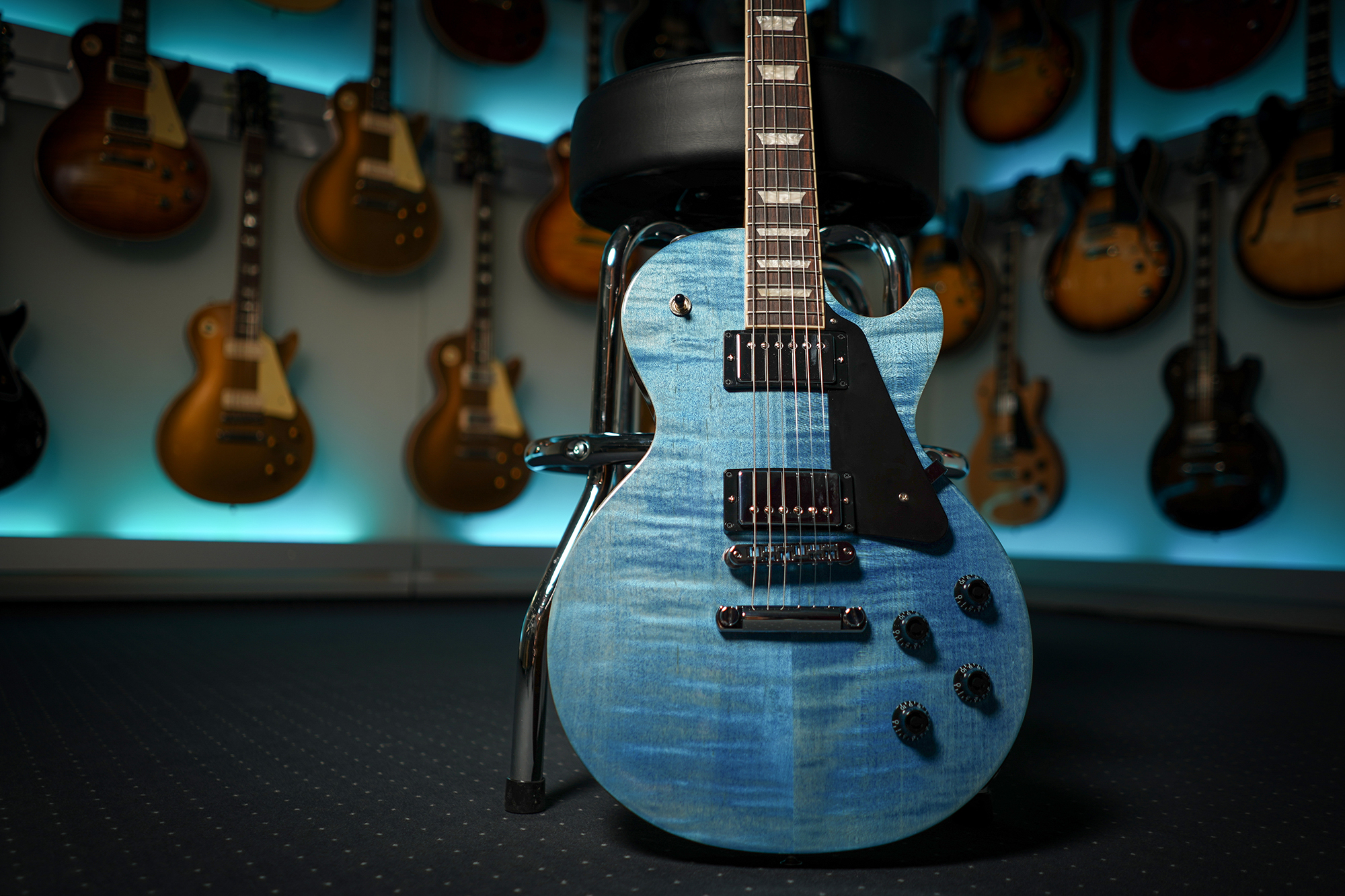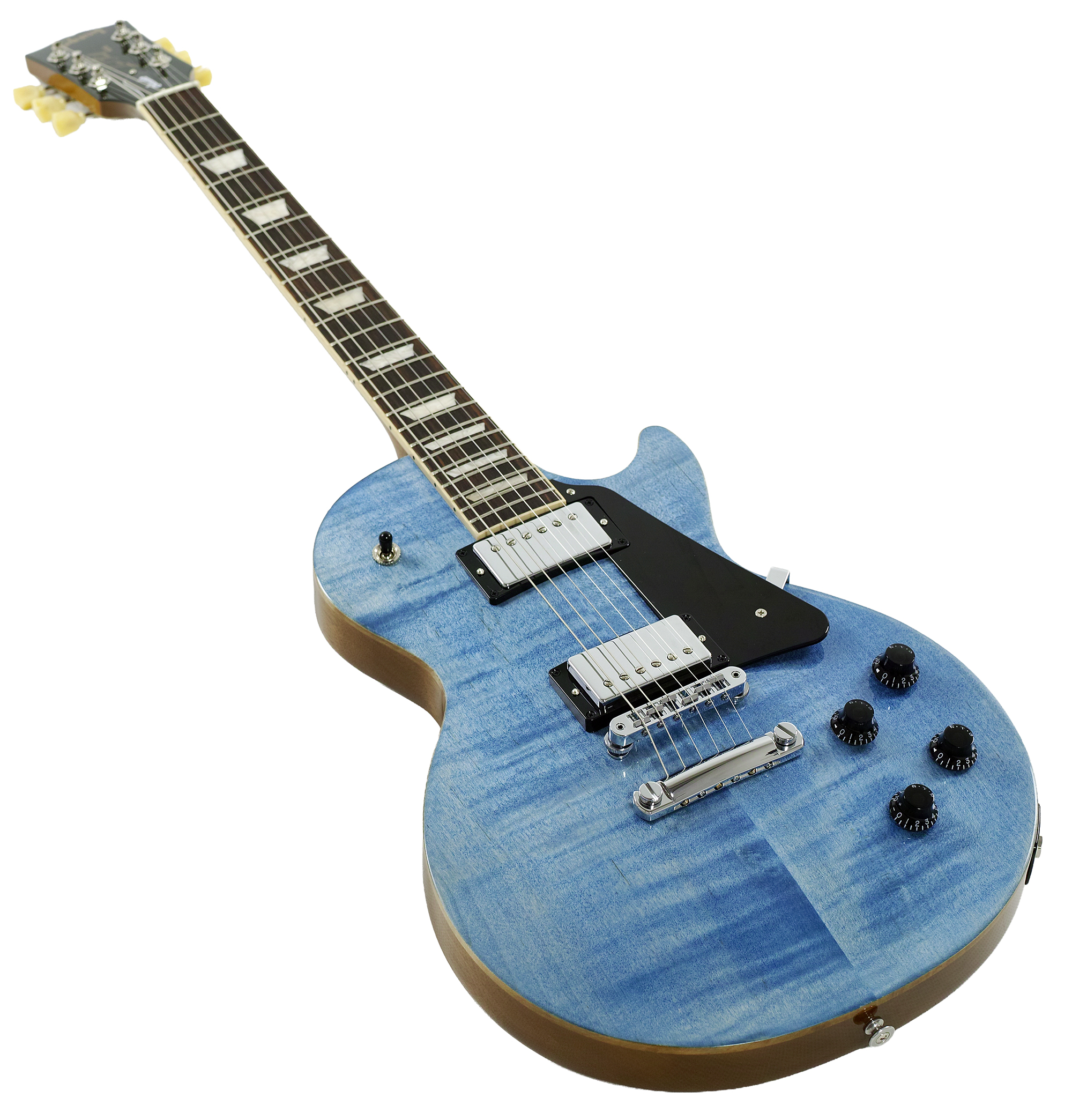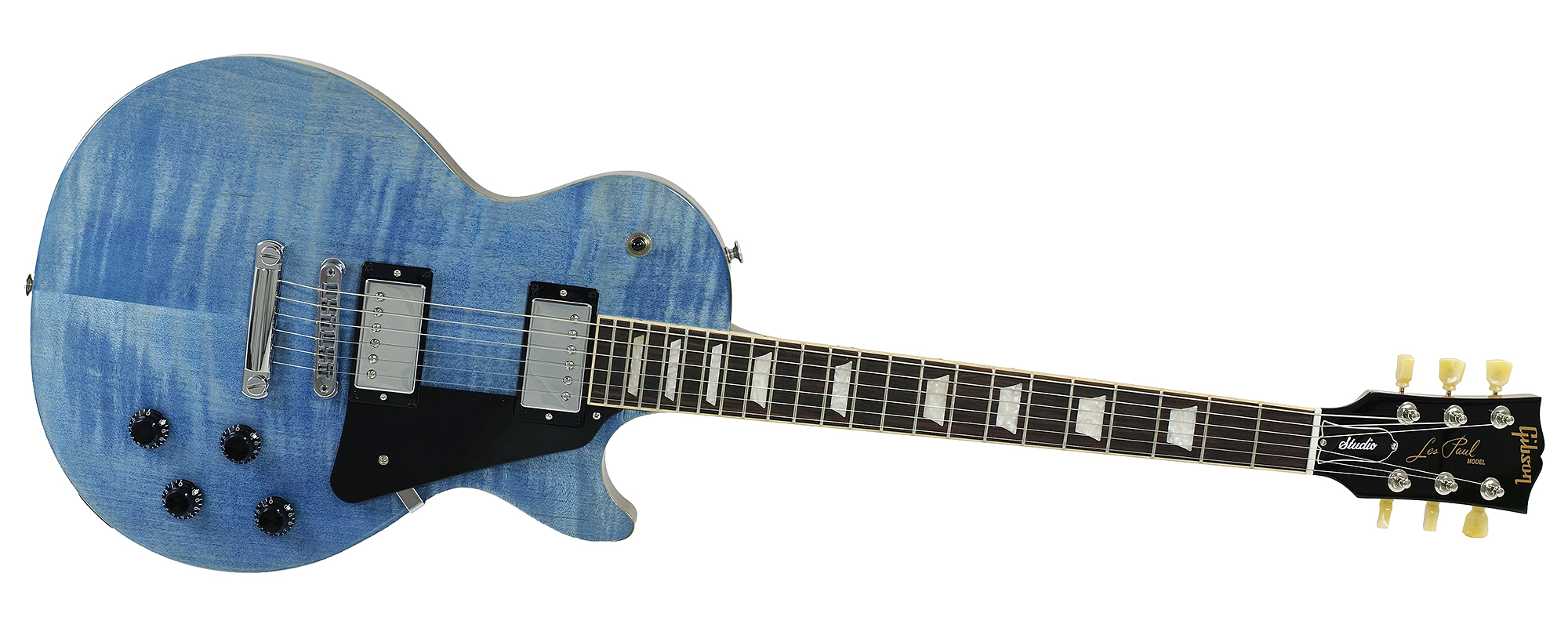 Gibson Les Paul Studio Figured Top E-Gitarre, Ocean Blue, mit Gigbag  |  Gibson USA Item no. 66463 Die Les Paul Studio verkörpert eine auf das Wesentliche reduzierte Les Paul mit Fokus auf Spielkomfort und klangliche Flexibilität - mit dem Slim-Taper-Neck und den splitbaren, heiß gewickelten Humbuckern ist das ein Leichtes. Sie bringt alle wesentlichen Zutaten einer Les Paul mit, wie etwa Mahagonikorpus mit Ahorndecke, Humbucker-Pickups und einen eingeleimten Hals, nur eben optisch etwas schlichter gehalten und somit sehr freundlich im Preis. Body Material: Mahogany Top Material: Maple Weight Relief: Ultra-Modern Finish: Gloss Nitrocellulose Lacquer Neck Material: Mahogany Neck Profile:Slim Taper Fingerboard Material: Indian Rosewood Fingerboard Radius: 12" Number of Frets: 22 Medium Jumbo Nut Material: Graphtech Nut Width: 43.05mm Inlays: Acrylic Trapezoids Bridge: Aluminum Nashville Tune-O-Matic Tailpiece: Aluminum Stopbar Tuners: Gibson Vintage Deluxe with Keystone Button Pick Guard: Black Neck Pickup: Burstbucker Pro Bridge Pickup: Burstbucker Pro Controls: 2 Push/Pull Volumes (Coil-Tap), 2 Tones & Toggle Switch inkl. Gibson Soft Shell Case Gig Bag Gewicht: 3,4 kg