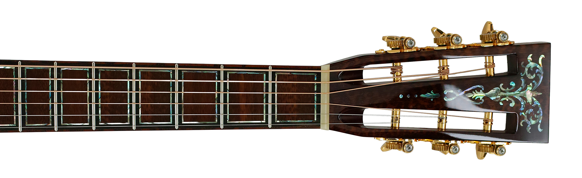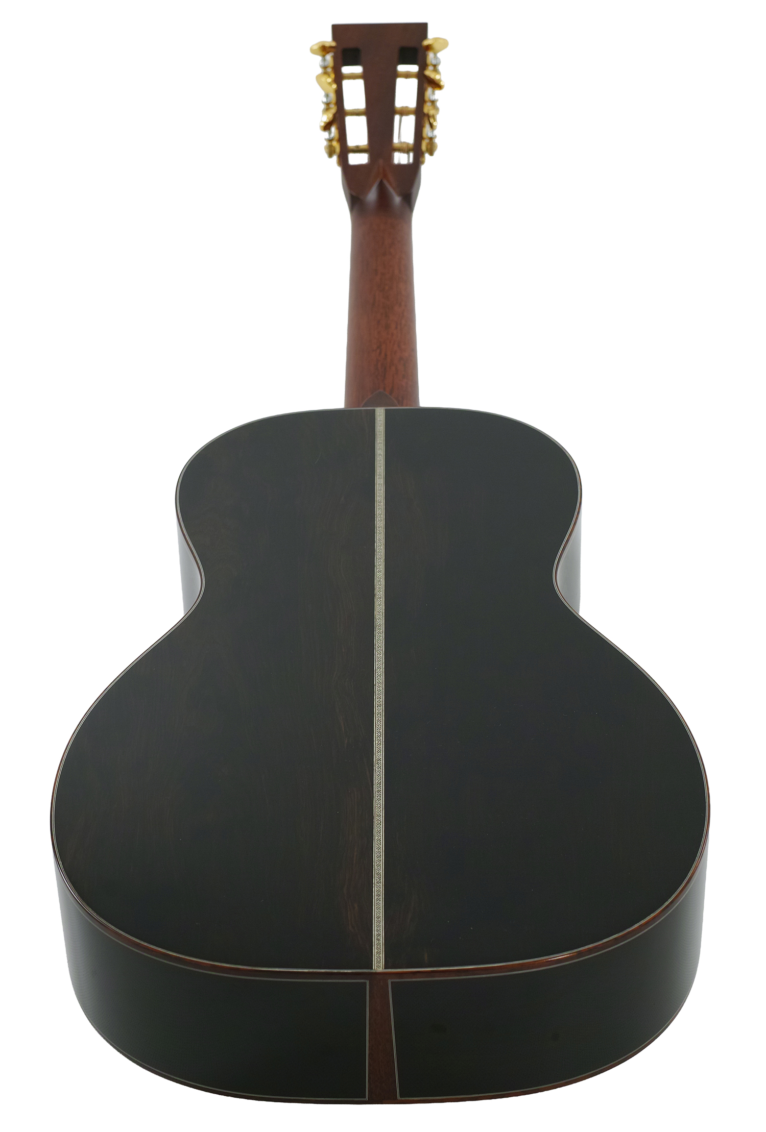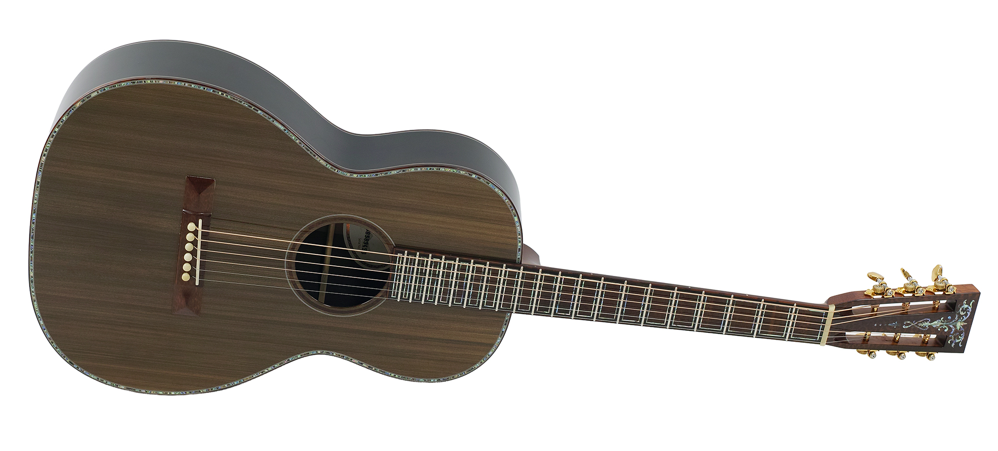 Hsienmo OO-12 Custom Thousand Year Ancient Sitka Spruce+African Blackwood  |  inkl. Case Item no. 66468 Hsienmo hat sich wieder an eine berühmte Vorlage gehalten, dieses Mal an die unter Insidern als "Ghost Oak" bekannte 00-Gitarre. Im Original wurde eine 8000-jährige Eiche für den Korpus und eine 3000-jährige Fichte verbaut - zu astronomischen Preisen. Hsienmo ist es gelungen, das ganz besondere Flair und die Ausstrahlung eines solchen Instruments einzufangen, zu einem Preis, der ziemlich "down to earth" ist. Der Korpus besteht aus "African Blackwood", ein exotisches Holz, das aufwändig zu verarbeiten ist sowie einer Decke aus 1000-jähriger Fichte. Der Sound besticht durch Tiefe und runden, warmen Charakter - ein echtes Ausnahme-Instrument. Li Chen mit seiner Marke "Hsienmo", die übrigens nach seiner Tochter benannt ist, orientiert sich mit seinen Gitarren an den großen Klassikern. Er kopiert sie allerdings nicht nur, sondern hebt sie mit innovativen Detaillösungen auf ein neues Level. Dazu gehören etwa ein geschraubter Hals, was bei Steelstringgitarren extrem selten anzutreffen ist. Ebenso ein "floating fretboard", also ein freischwebendes Griffbrett über dem Korpus, so dass Verspannungen zwischen den Hölzern auszuschließen sind. Desweiteren sind je nach Modell ausgehöhlte Bracings im Einsatz, karbonverstärkte Hälse, ultradünnes UV-Finish und bei bestimmten Modellen sogar Decken in Doubletopbauweise, um auch noch das letzte Quentchen Sound herauszuholen. Der Aufwand hat sich gelohnt: etablierte Gitarrendesigns mit technischen Details auf Topniveau zu einem erstaunlich freundlichen Preis! Details: * Decke: massive 1000 Jahre alte Sitka-Fichte * Zargen und Boden: massives afrikanisches Blackwood * Bracing: Adirondack scalloped X-Bracing * Mechaniken: Grover Tuners Open Gear Gold * Hals: 1 teilig afrikanisches Mahagoni mit Carbon Verstärkung und Binding aus Schlangenholz * Kopfplatte: slotted head stock * Griffbrett: Ebenholz mit Schlangenholz/Abalone Inlays * Korpusbinding vorne: Schlangenholz und Abalone * Korpusbinding hinten: Schlangenholz * Sattel: geölter Kamelknochen * Stegeinlage: Kamelknochen * Steg: Schlangenholz * Pins: geölte Kamelknochen (zusätzliche Pins aus Schlangenholz mit Abalone Dot liegen bei) * Schalllocheinlage: Schlangenholz * Mensur: 630 mm * Sattelbreite: 43,5 mm * Lackierung: Nitro-hochglanz * Coated Phoshor Bronze 12-53 * Gewicht: 2,23 kg * inkl. Koffer