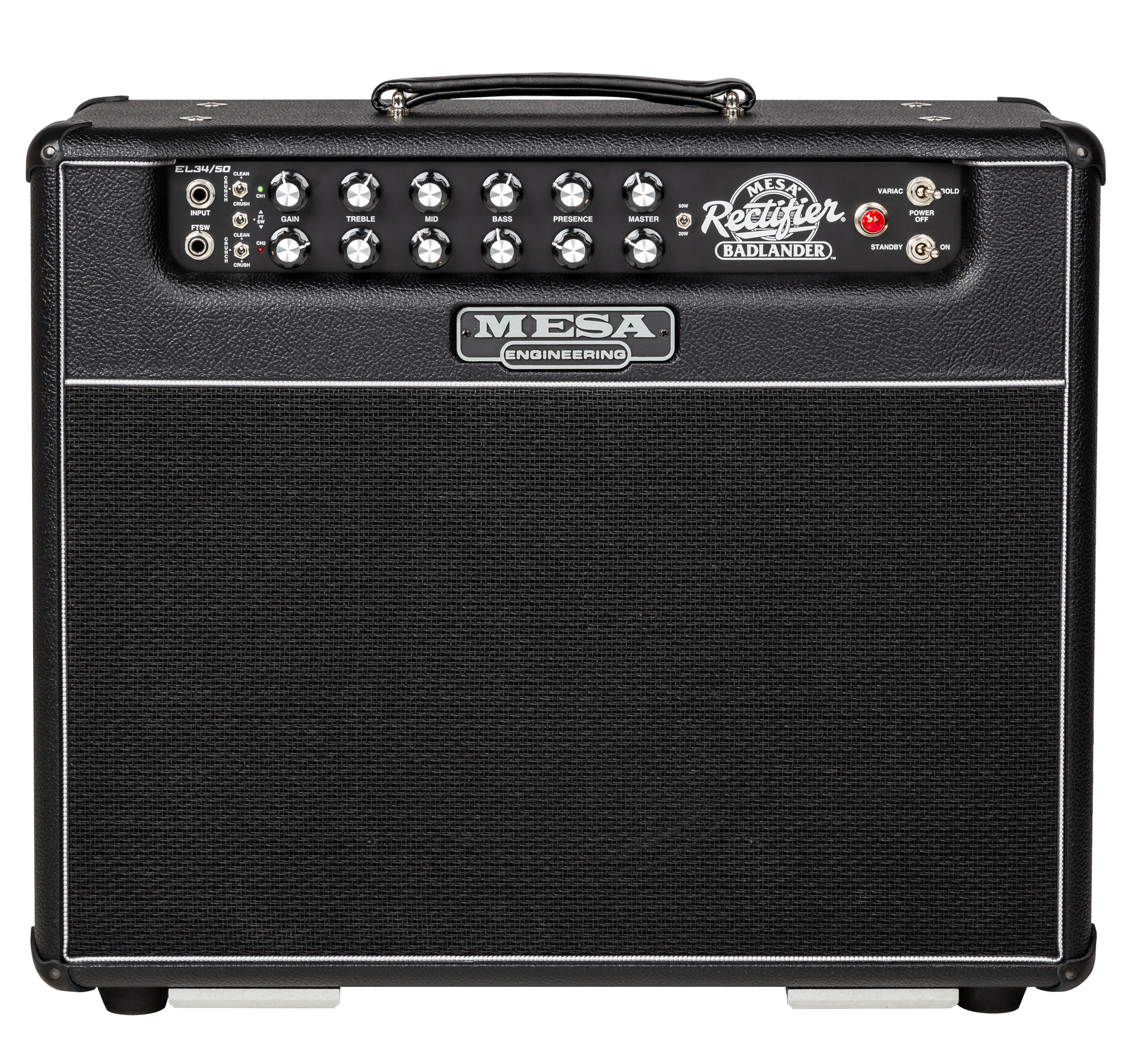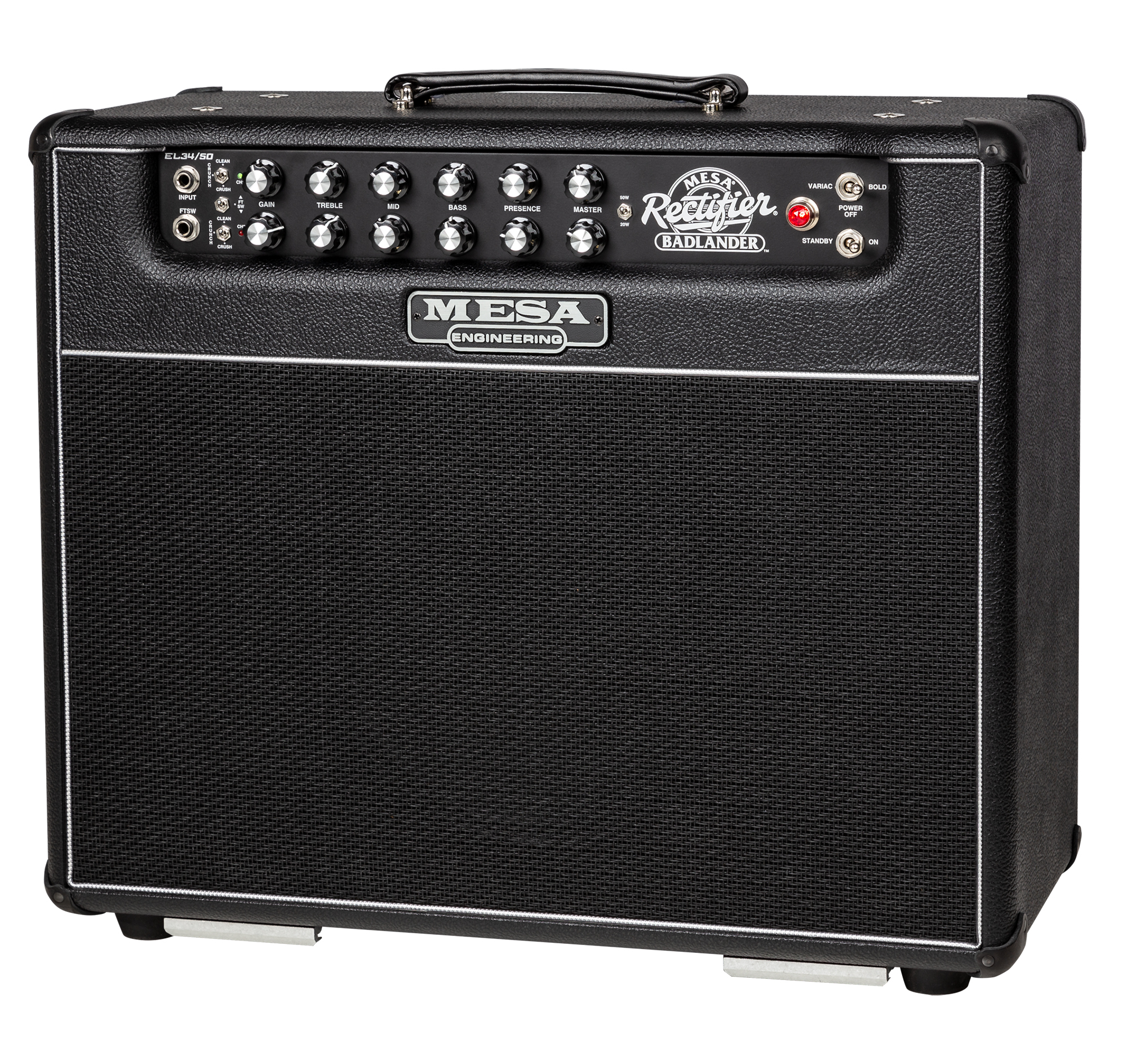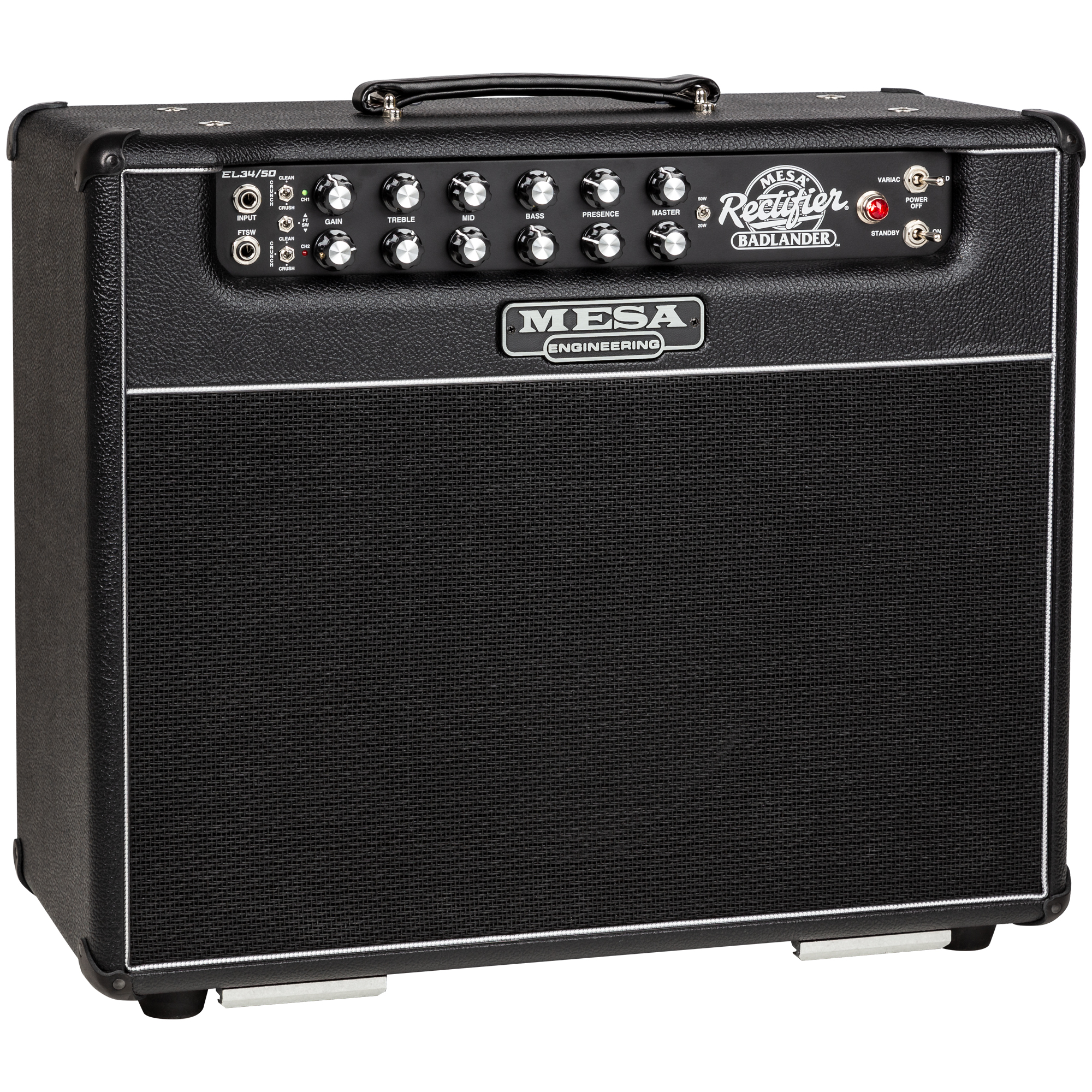 Mesa Boogie Badlander 50 Combo 1x12" Combo, 50W schaltbar auf 20W  |  1 x 12" Celestion Creamback 65 Art.-Nr. 66623 Der Mesa Boogie Badlander 50 ist ein moderner, zweikanaliger Röhrenverstärker aus der legendären Rectifier-Serie, der für einen strafferen, aggressiveren Sound mit britischem Einschlag (durch EL34-Röhren) entwickelt wurde. Specs: * 2 Kanäle mit jeweils drei Modi: Clean, Crunch und Crush. * Leistung: 50 W - umschaltbar auf 20 W * Lautsprecher: 1 x 12" Celestion Creamback 65 * Vorstufenröhren: 5 x 12AX7 * Endstufenröhren: 2 x EL34 * Regler: je 2 x Gain, Treble, Mid, Bass, Presence, Master, Cab Select (Ch1/Ch2) und 1 x Level * Schalter: 2 x Crunch (Clean/Crush), Channel select (footswitch) 50w/20w, Variac/Off/Bold, Gnd/Lift, Bias (EL34/6L6) * Kopfhörerausgang: 6,3 mm Klinke * Maße: (B x T x H): 578 x 264 x 489 mm * Gewicht: 27,2kg * Zubehör: inkl. 1 x Fußschalter (Ch1/Ch2) und Schutzhülle