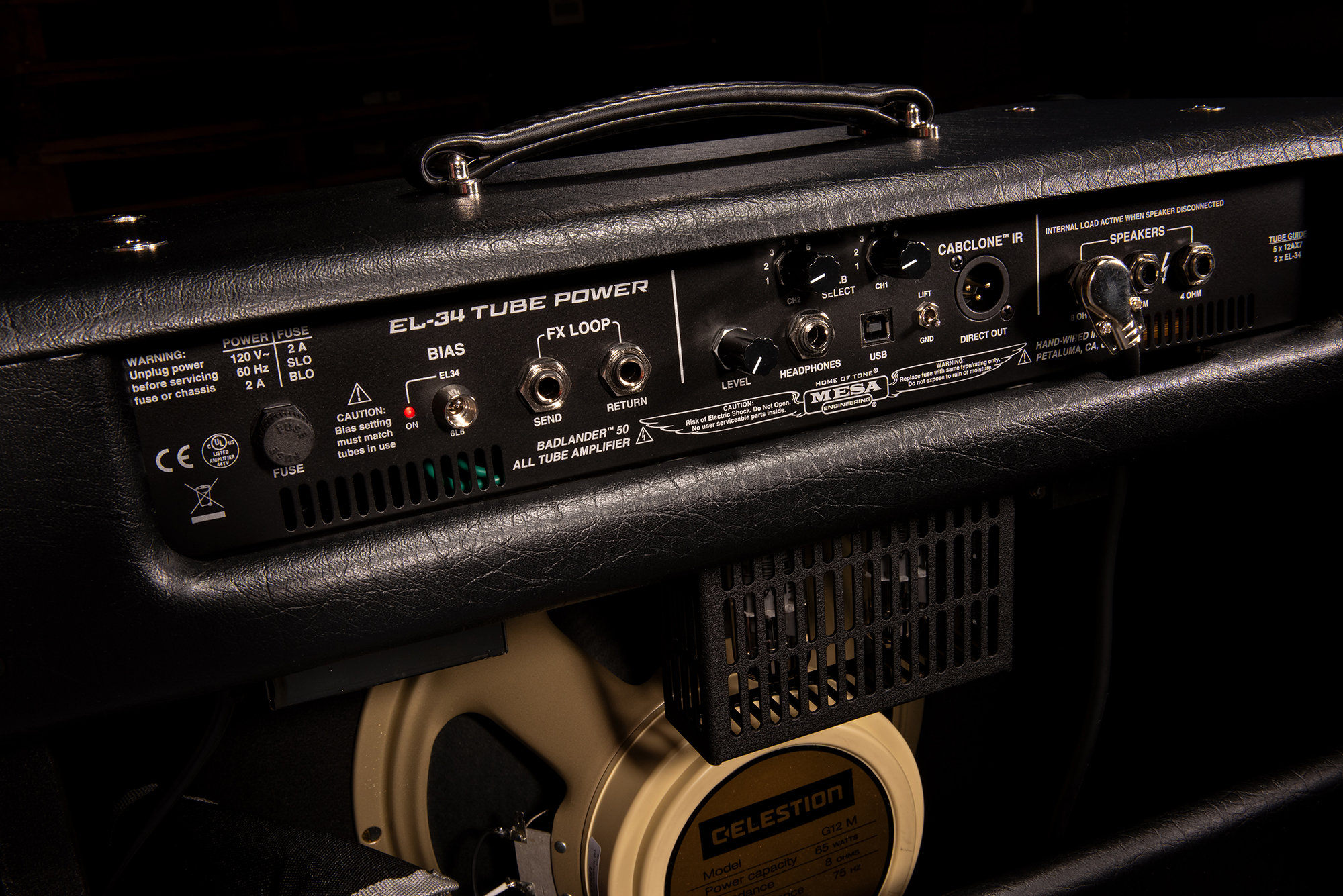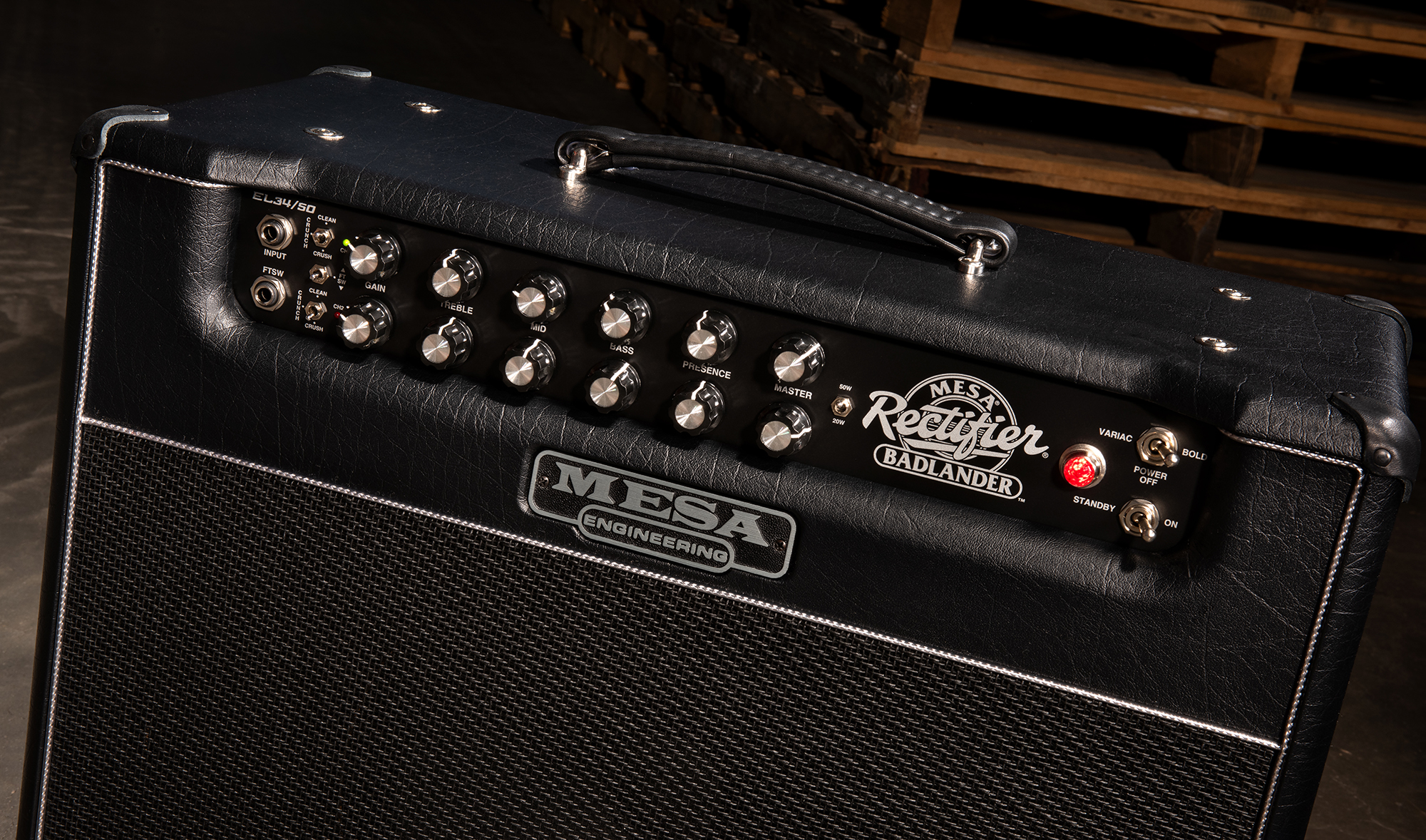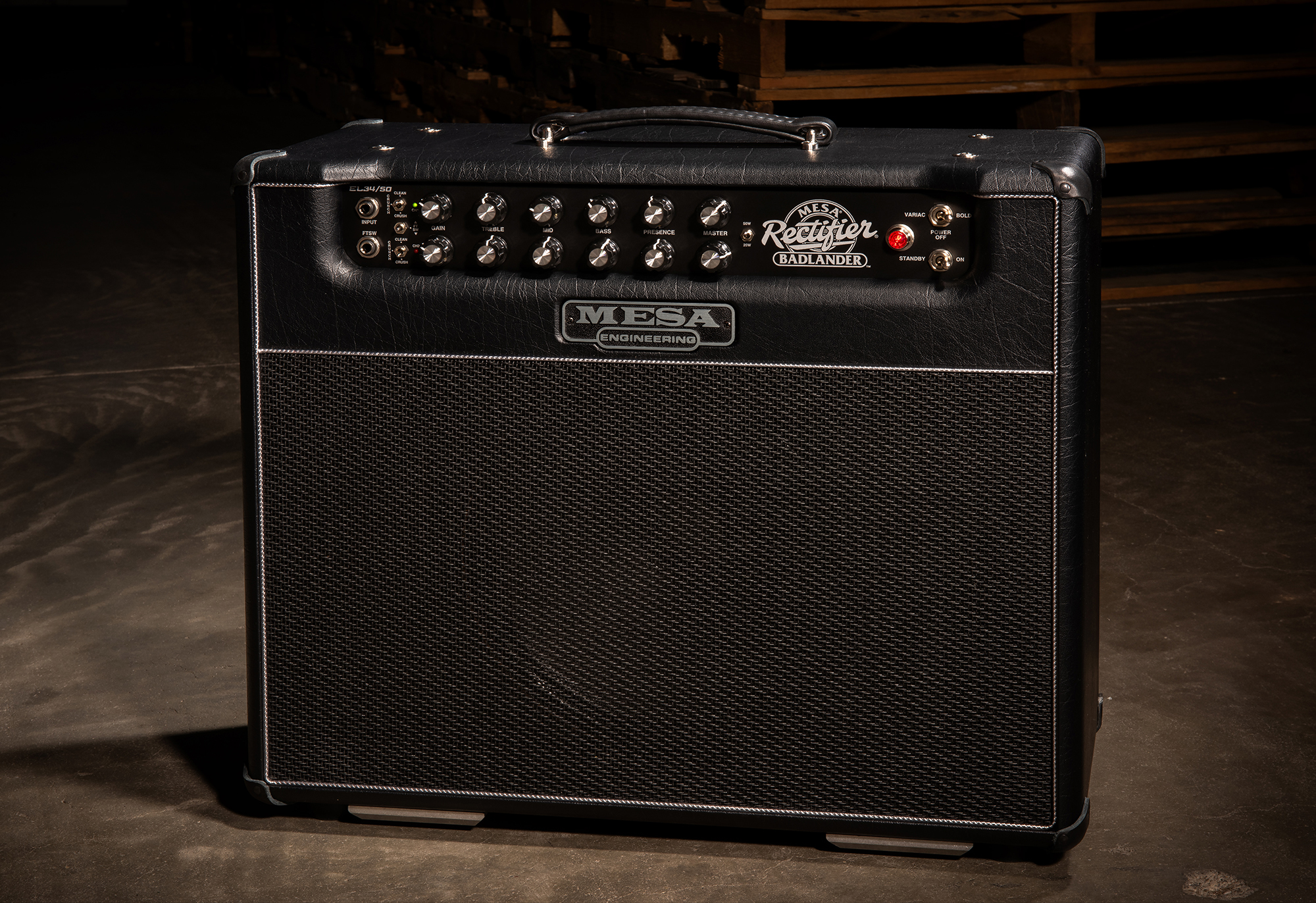 Mesa Boogie Badlander 50 Combo 1x12" Combo, 50W schaltbar auf 20W  |  1 x 12" Celestion Creamback 65 Art.-Nr. 66623 Der Mesa Boogie Badlander 50 ist ein moderner, zweikanaliger Röhrenverstärker aus der legendären Rectifier-Serie, der für einen strafferen, aggressiveren Sound mit britischem Einschlag (durch EL34-Röhren) entwickelt wurde. Specs: * 2 Kanäle mit jeweils drei Modi: Clean, Crunch und Crush. * Leistung: 50 W - umschaltbar auf 20 W * Lautsprecher: 1 x 12" Celestion Creamback 65 * Vorstufenröhren: 5 x 12AX7 * Endstufenröhren: 2 x EL34 * Regler: je 2 x Gain, Treble, Mid, Bass, Presence, Master, Cab Select (Ch1/Ch2) und 1 x Level * Schalter: 2 x Crunch (Clean/Crush), Channel select (footswitch) 50w/20w, Variac/Off/Bold, Gnd/Lift, Bias (EL34/6L6) * Kopfhörerausgang: 6,3 mm Klinke * Maße: (B x T x H): 578 x 264 x 489 mm * Gewicht: 27,2kg * Zubehör: inkl. 1 x Fußschalter (Ch1/Ch2) und Schutzhülle