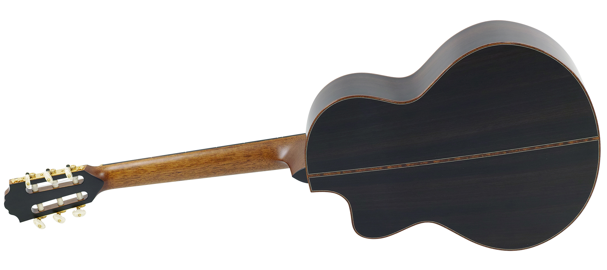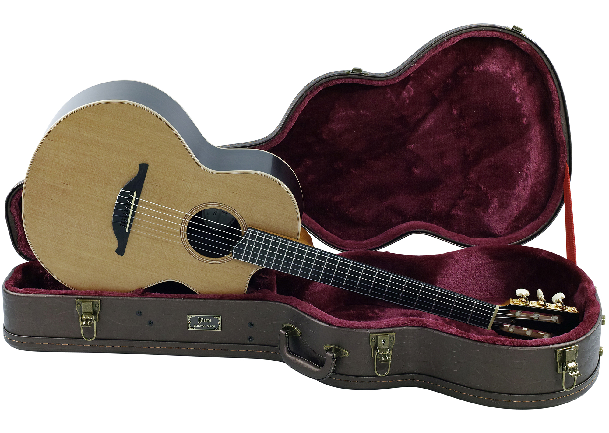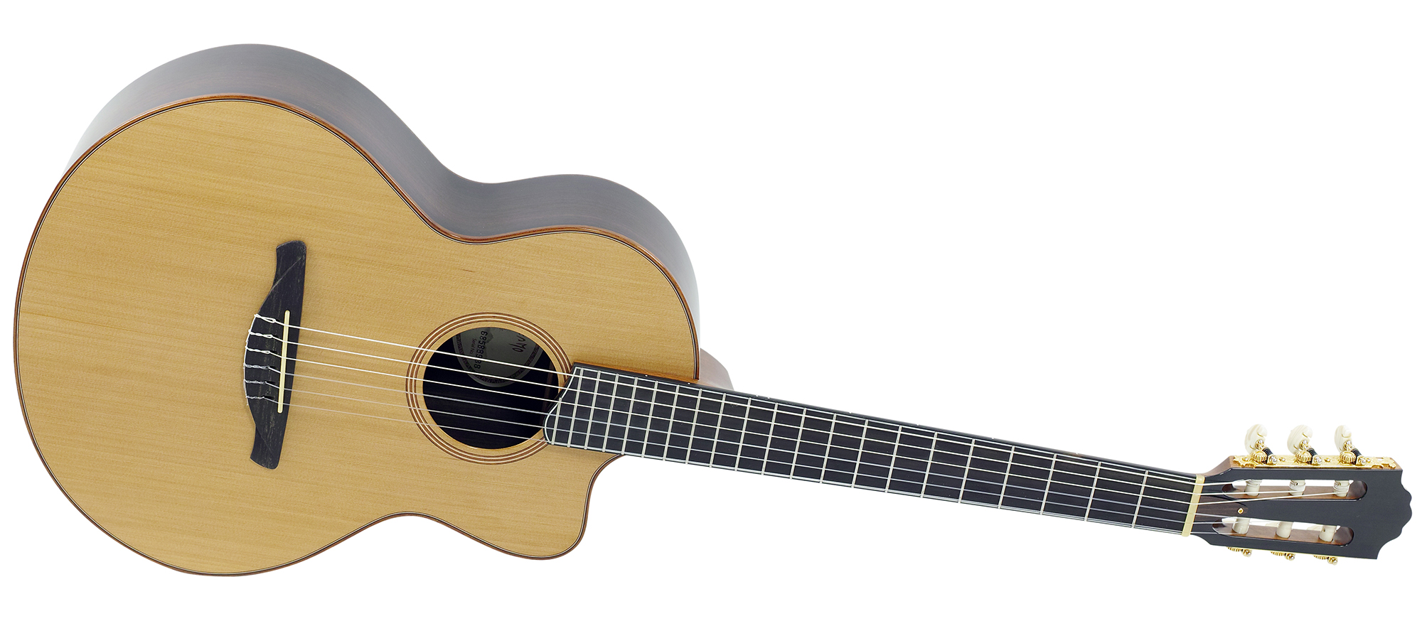 Dazu gehören etwa ein geschraubter Hals, was bei Akustikgitarren extrem selten anzutreffen ist. Ebenso ein "floating fretboard", also ein freischwebendes Griffbrett über dem Korpus, so dass Verspannungen zwischen den Hölzern auszuschließen sind. Desweiteren sind hier massive Hölzer verbaut, ein ultradünnes UV-Nitro-Finish und klassische Fächerbeleistung, um auch noch das letzte Quentchen Sound herauszuholen. Der Aufwand hat sich gelohnt: eine kompakte Crossover-Gitarre mit allen klanglichen Attributen, die eine wohltönende Nylonstring in Topqualität ausmachen.
