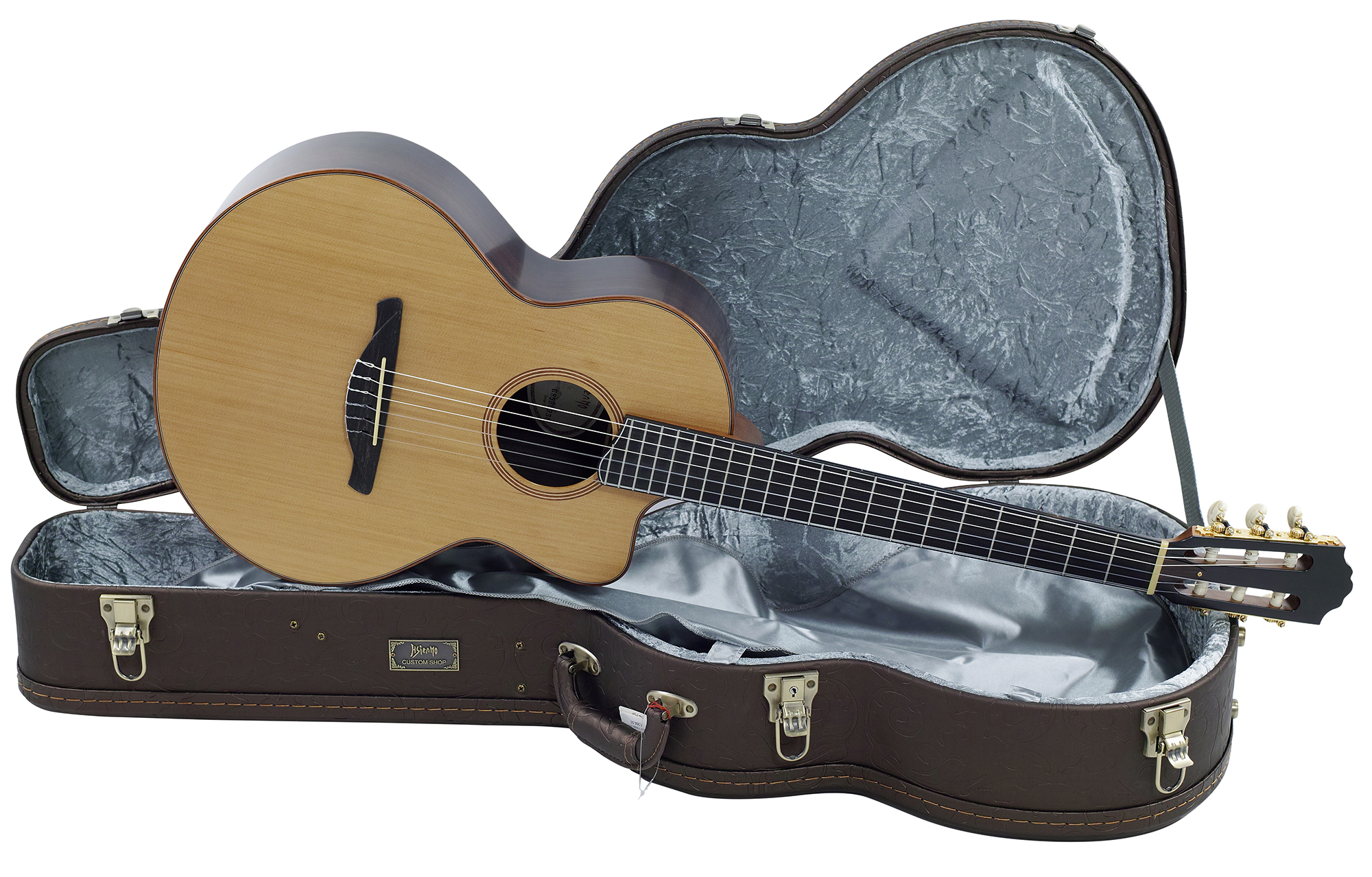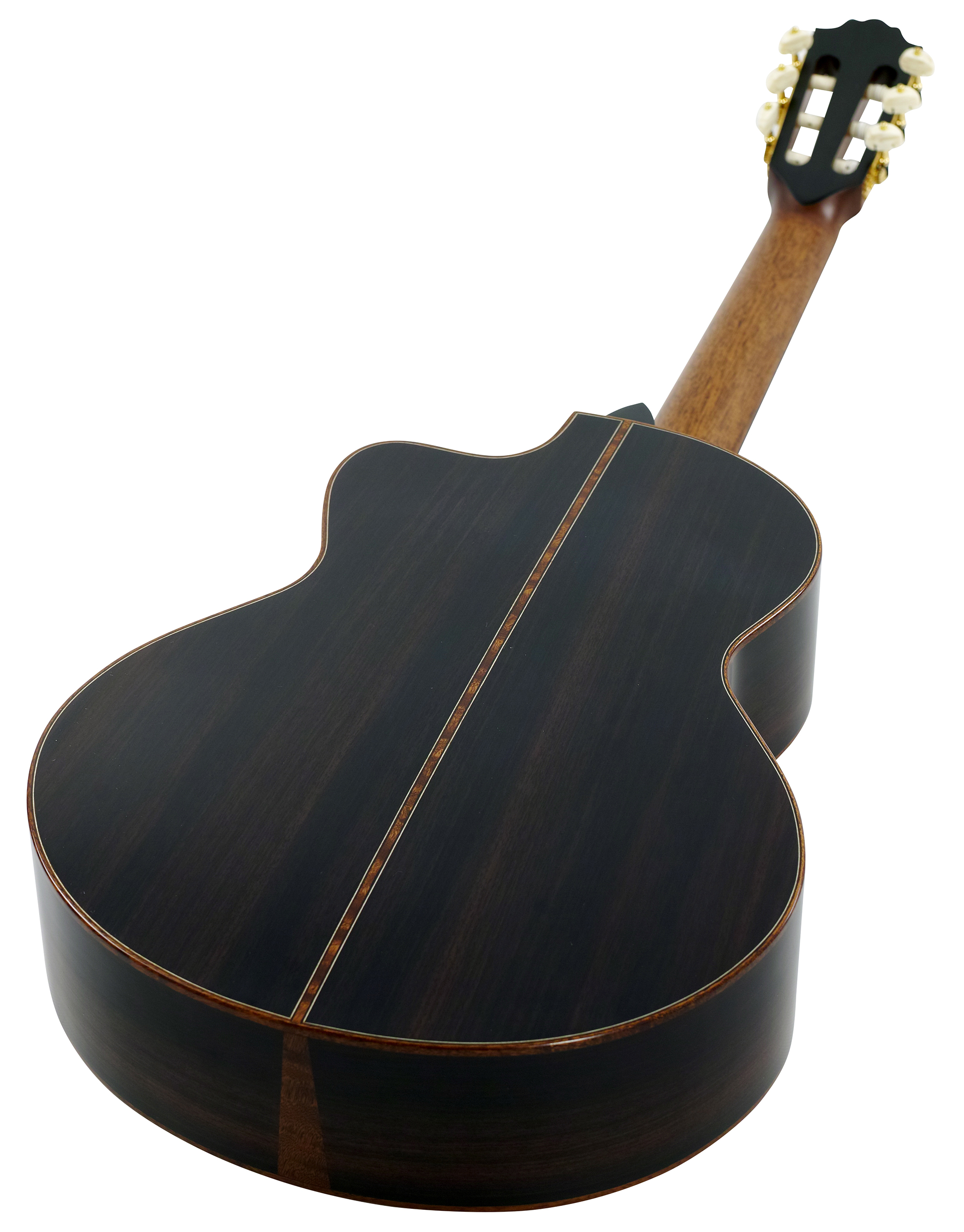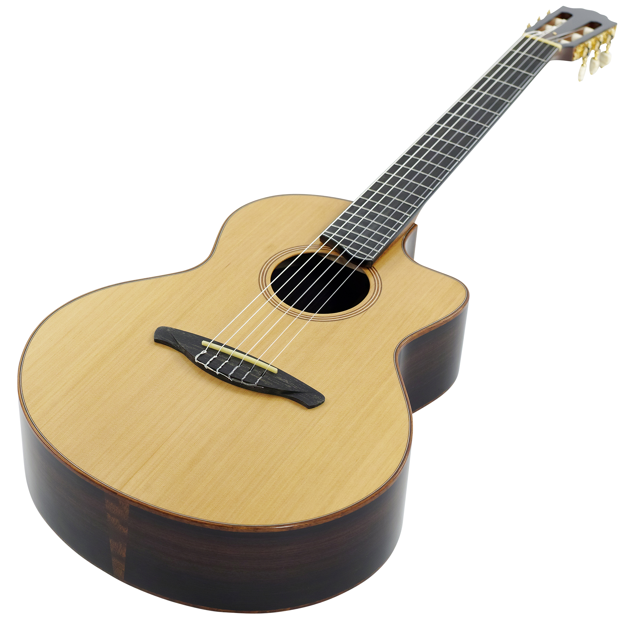 Dazu gehören etwa ein geschraubter Hals, was bei Akustikgitarren extrem selten anzutreffen ist. Ebenso ein "floating fretboard", also ein freischwebendes Griffbrett über dem Korpus, so dass Verspannungen zwischen den Hölzern auszuschließen sind. Desweiteren sind hier massive Hölzer verbaut, ein ultradünnes UV-Nitro-Finish und klassische Fächerbeleistung, um auch noch das letzte Quentchen Sound herauszuholen. Der Aufwand hat sich gelohnt: eine kompakte Crossover-Gitarre mit allen klanglichen Attributen, die eine wohltönende Nylonstring in Topqualität ausmachen.