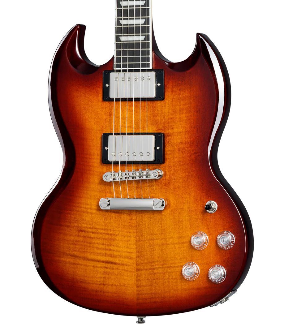 Die SG Modern Figured aus der Inspired by Gibson™ Collection von Epiphone hat das klassische SG™-Korpusprofil aus Mahagoni und eine Ahorn-Decke mit einem AAA-Veneer aus geflammtem Ahorn. Angetrieben von einem Paar Epiphone ProBucker™ humbucker™ Tonabnehmer mit Coil-Splitting, Phase-Schalter und einer Treble Bleed-Schaltung für eine Vielzahl von Sounds. Außerdem verfügt sie über ein Ebenholz-Griffbrett, ein asymmetrisches SlimTaper™-Halsprofil, erstklassige Grover® Locking Rotomatic® Mechaniken, Posi-Lok™ Gurtknöpfe und einen Graph Tech® NuBone® Sattel. Ein hochwertiges Gig-Bag ist im Lieferumfang enthalten.