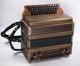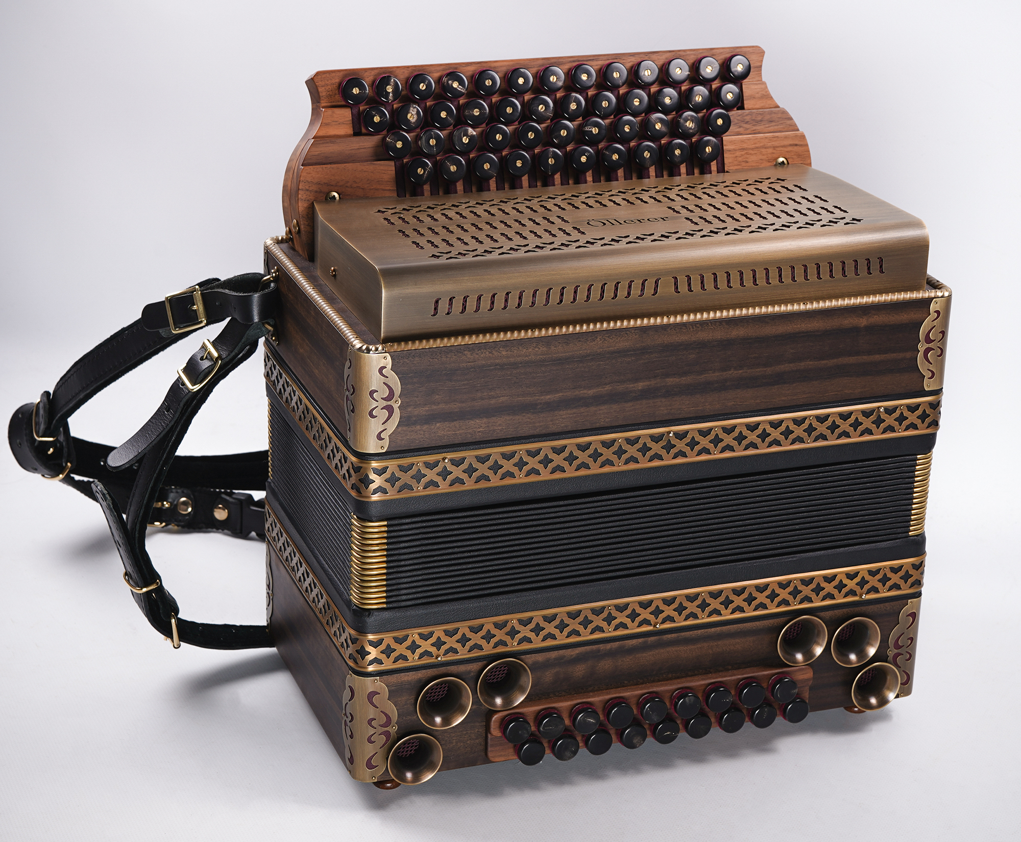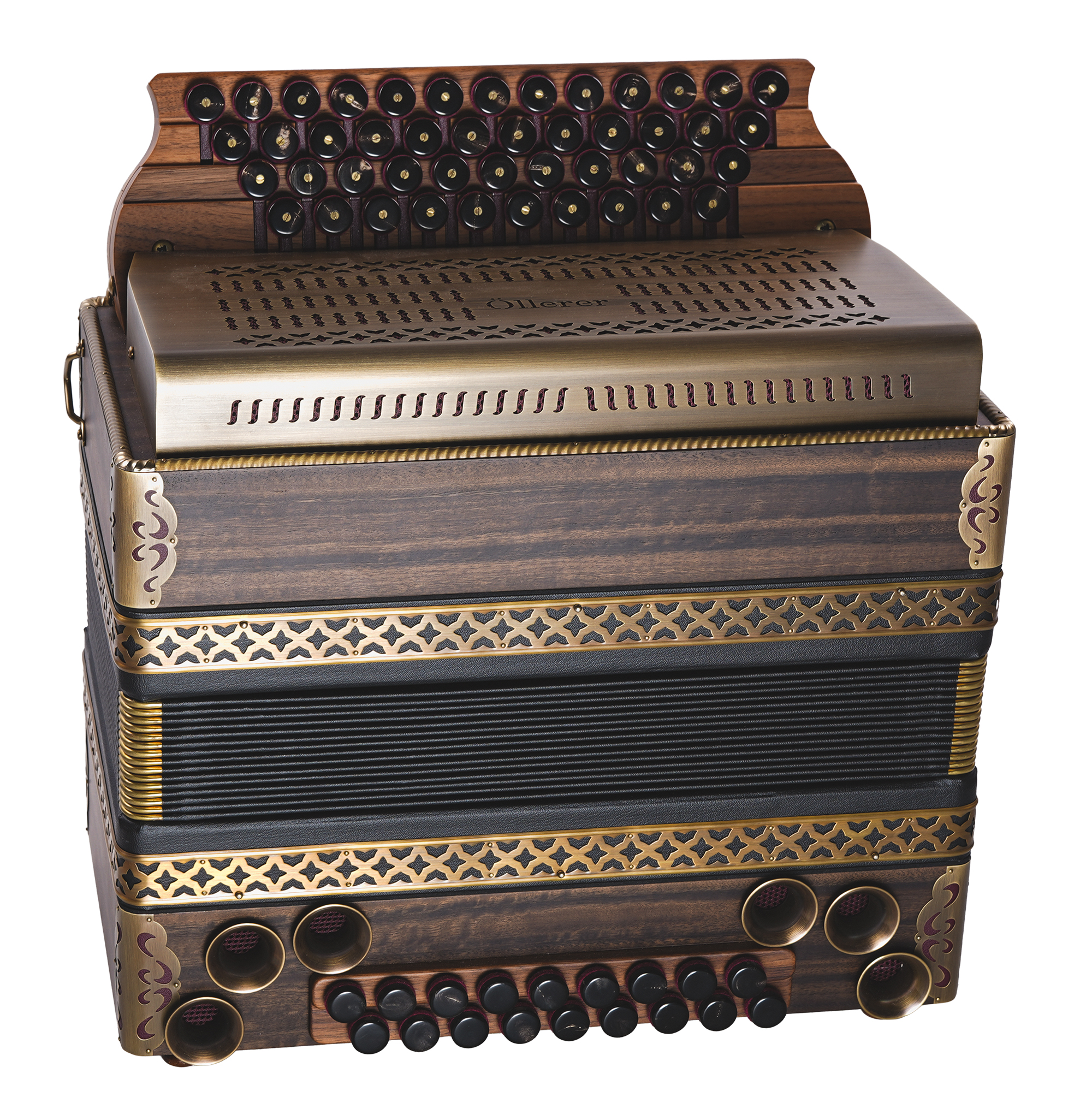 Öllerer Harmonika 346/18 Serie 5 Luxus 4-Reiher, Eukalyptus  |  A-D-G-C, sehr sehr flach Art.-Nr. 64801 DETAILS Gehäuse: Eukalyptus geräuchert längs Kantenschutz: Altmessing Balgrahmen: Altmessing Lackierung: Matt Stimmung: A-D-G-C Tremolo: sehr sehr flach Kammerton: 441' ~~~~~~~~~~~~~~~~~~~~~~~~~~~ Belegung Diskanttastatur: versetzt ~~~~~~~~~~~~~~~~~~~~~~~~~~~ Bass-System: Öllerer normal, 4x moll auf Druck 1x Koppelung 1x Zusatzbass Bassholzleiste: gerade Bassmensur: normal Balg: -------------------------------- Außenfarbe: schwarz Dirndlstoff: weinrot mit Musterung Ecken: messing -------------------------------- Farbe Tastatur und Unterlagen: weinrot Diskantknöpfe: Büffelhorn Bassknöpfe: Büffelhorn Lufttaste Bassriemen: schwarz Handpolster: wahlweise Balgschoner: wahlweise Bassriemenverstellung: Rad Schalltrichter: Altmessing Zierleiste: Altmessing inkl. Rucksack und Riemen