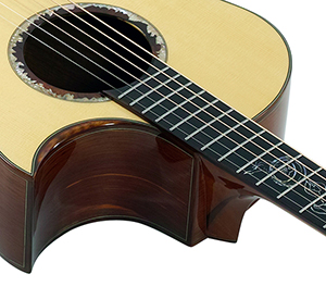 Utopia Guitars hat daher sehr viel Zeit und Energie in die Erforschung des Zusammenwirkens von verschiedenen Hölzern und Konstruktionsprinzipien investiert. Hierzu gehört u.a. die sorgfältige Abstimmung des Resonanzverhaltens von Decke und Boden. Der Boden ist minimal gewölbt und dadurch von erhöhter Stabilität. Das wiederum bringt ein lebendiges Reflexionsverhalten mit sich.